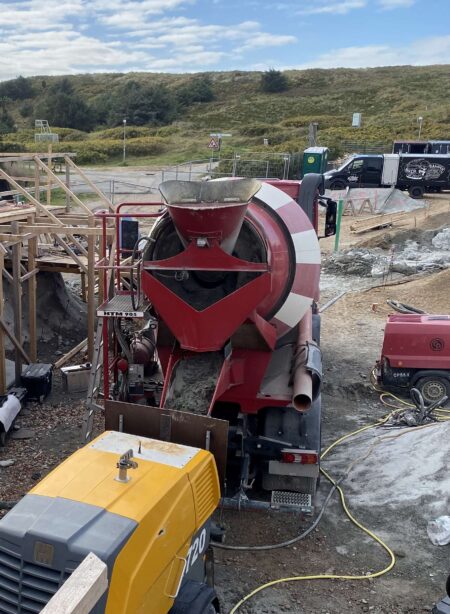 Bautechnisch ist die Konstruktion eine Herausforderung, die das erfahrene Team von Anker-Rampen souverän meistert. Im sogenannten Spritzbetonverfahren wird die Oberfläche Stück für Stück aufgetragen und anschließend manuell geglättet.